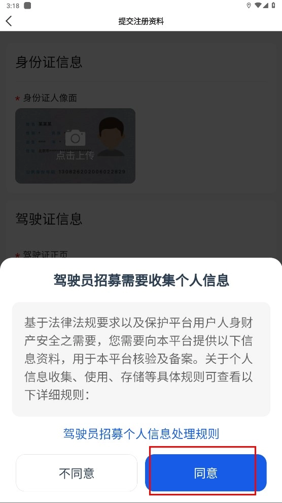 2、在个人信息收集提示框点击【同意】,即可继续提交注册资料,推进雷利出行司机端的注册进程。