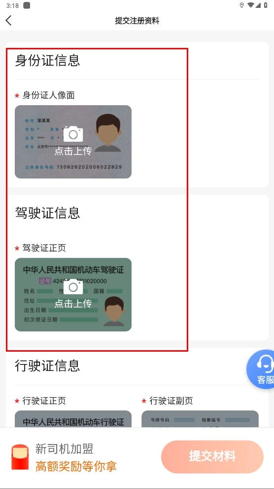 3、进入提交资料页面,上传【身份证人像面】-【驾驶证正页】等信息,完善雷利出行司机端的注册资料。