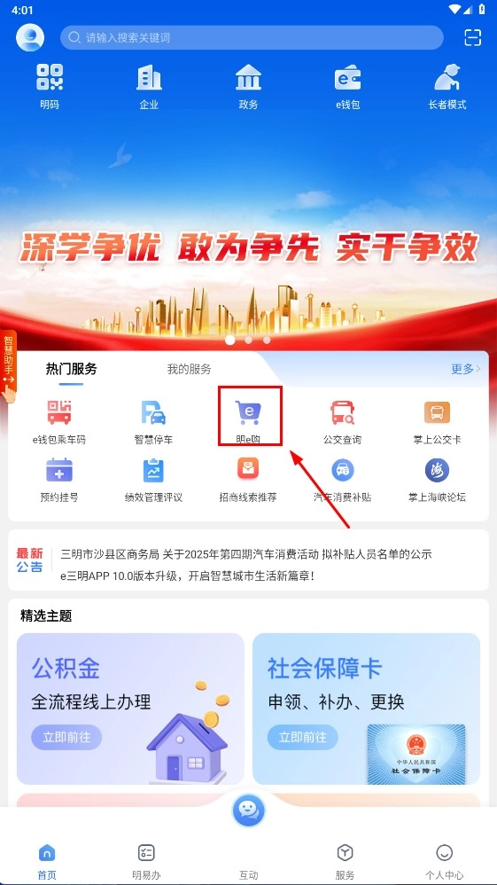 1、打开e三明首页,在热门服务板块中找到【明e购】图标,点击该图标就能进入本地生活服务购物平台。