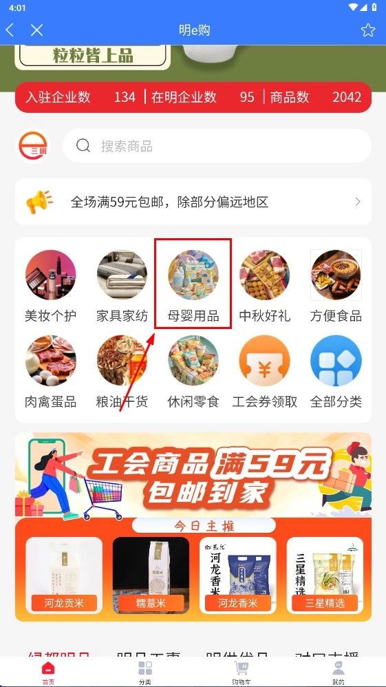 2、在明购页面,选择如【母婴用品】分类,可查看该类别下的各类母婴相关商品列表。