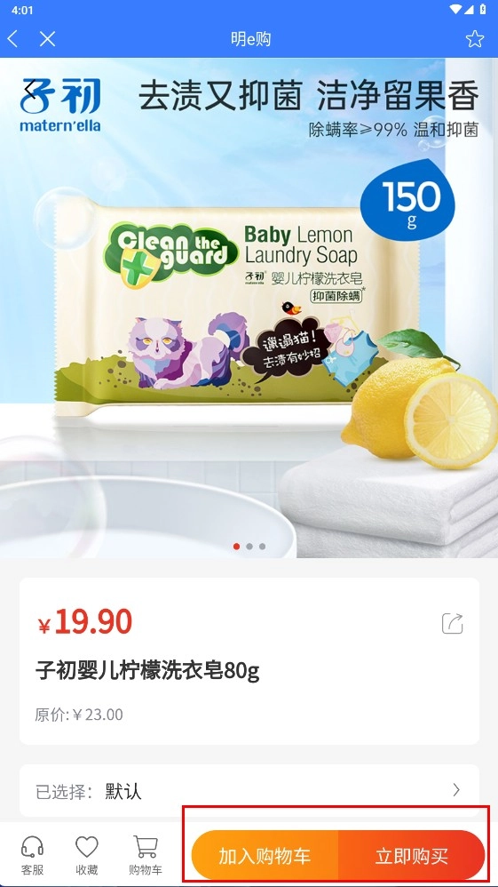 4、进入子初婴儿柠檬洗衣皂详情页后,可点击【加入购物车】或【立即购买】完成商品选购流程。
