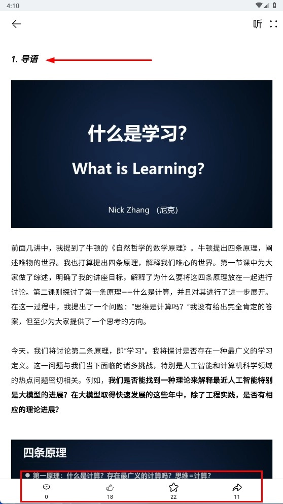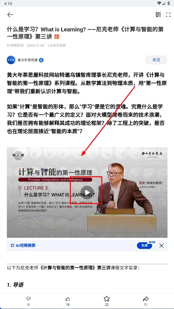 3、查看讲座的文字内容,了解【计算与智能的第一性原理】核心观点,参与互动讨论。