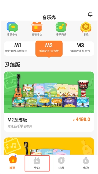 1、启动音乐壳应用程序,在主界面里找到“学习”按钮并点击它,随后进入与学习相关的功能页面。