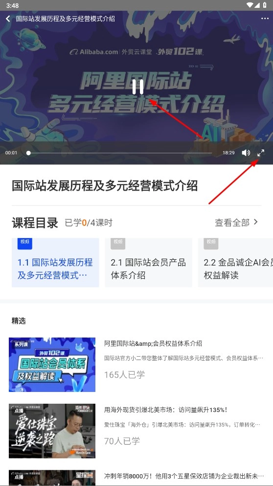 4、开始学习后,通过课程视频与目录,能深入了解国际站发展历程、多元经营模式及会员权益等核心内容。