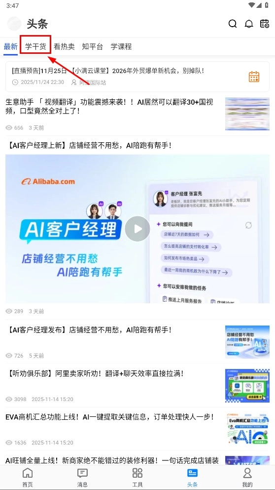 1、进入【学干货】板块,能够查看直播预告、客户经理分享以及视频翻译等外贸经营相关的干货内容,帮助商家增强业务能力。