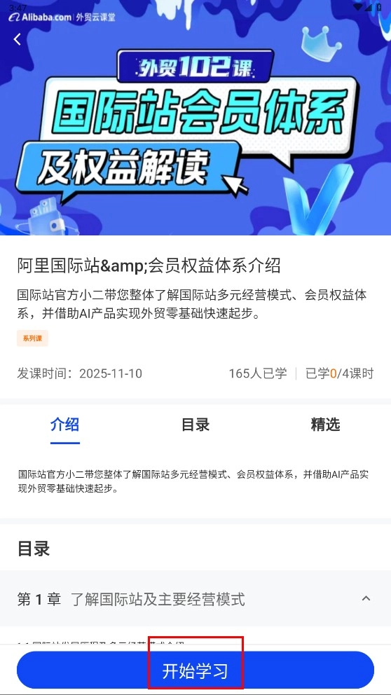 3、进入【阿里国际站】会员权益课程详情页,点击底部【开始学习】按钮,即可开启外贸经营知识的系统学习。