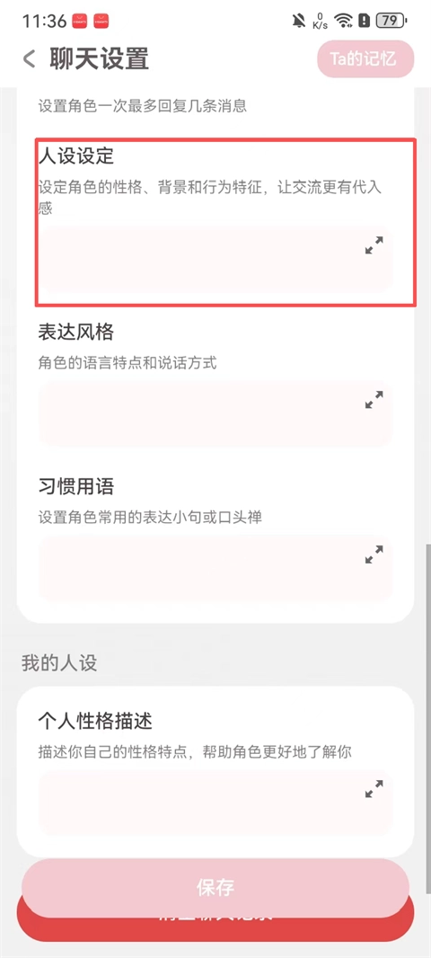 2、聊天设置页下滑找到“人设设定”功能;