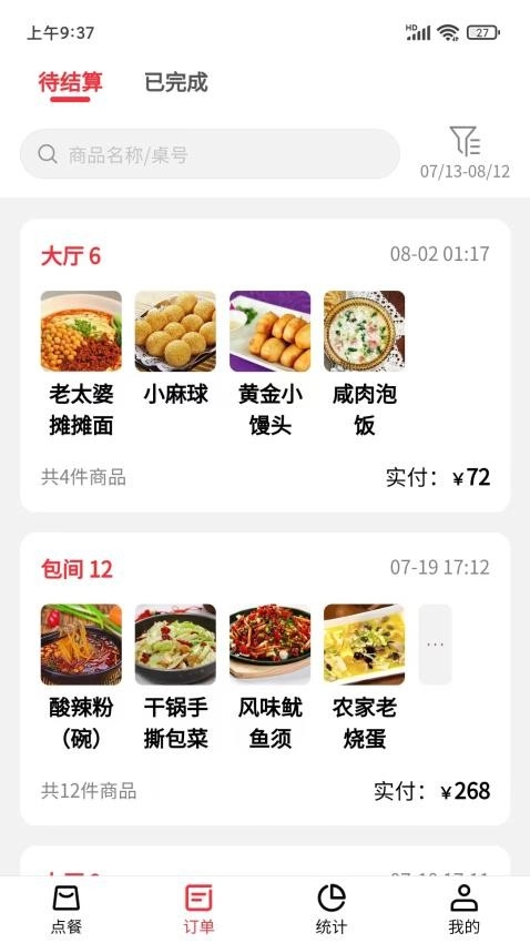 在订单管理中心可以查看到顾客点餐订单的待结算以及已完成的状态详情。