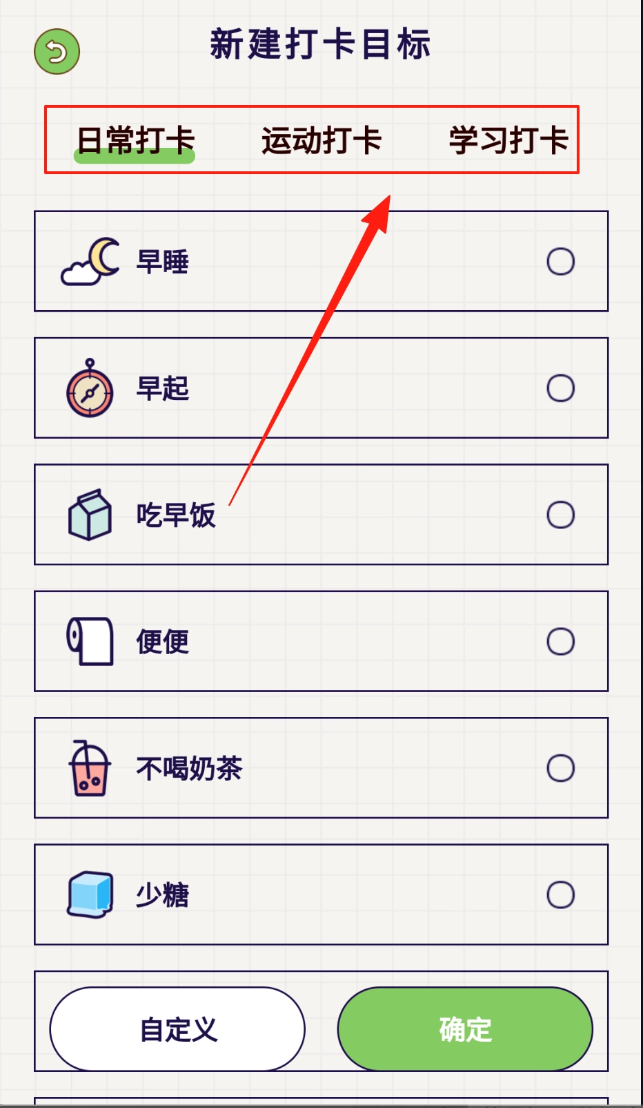 1、好习惯打卡平台为我们提供了丰富多样的类别选择,像跑步、早起、吃水果等都包含在内,而且它还支持用户自定义添加项目呢。
