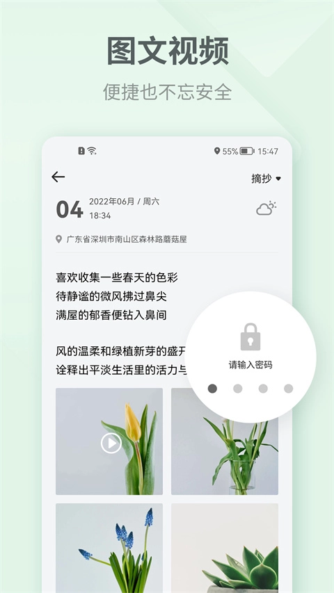 2、多渠道分享设置:支持将日记一键分享至微信、QQ等主流社交平台,方便与亲友分享生活点滴或重要时刻。