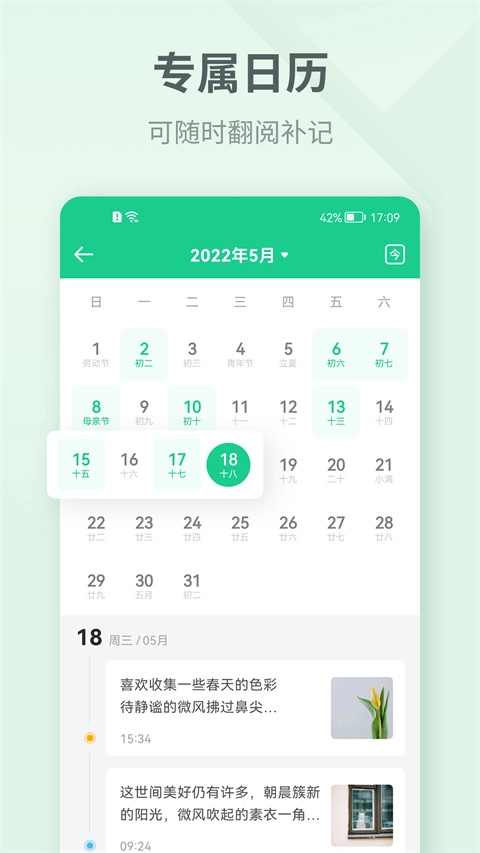 1、日历精准检索:通过日历视图快速定位特定日期的日记内容,配合搜索功能实现秒速查找,不错过任何重要记录。