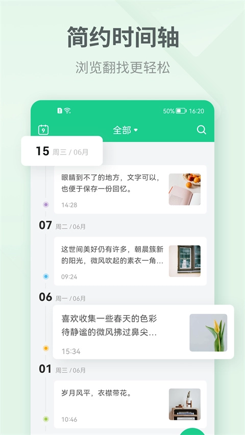 1、时光轴浏览模式:运用清晰直观的时间轴设计,助力用户依照时间顺序回顾过往记录,每个关键瞬间都能清晰呈现。