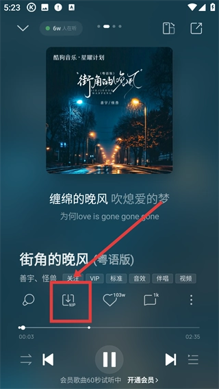 4、在歌曲播放页面点击【(VIP)】按钮,可进行该歌曲的VIP操作。