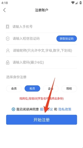 4、选择身份,然后按照要求认真填写信息,检查一遍确认没有问题,点击“开始注册”就行了。