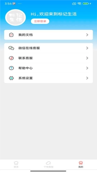 3、在个人中心页面,点击【立即登录】按钮,可进入账号登录流程,页面还包含【我的文档】【帮助中心】等功能选项。