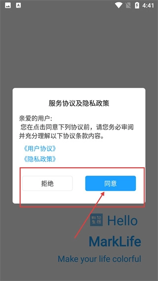 进入应用后,需阅读涵盖《用户协议》与《隐私政策》内容的【服务协议及隐私政策】,点击【同意】按钮就能进入应用主界面。
