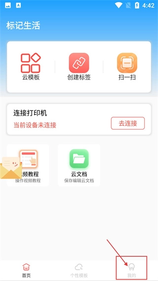 2、进入主界面,可看到【云模板】【创建标签】等功能,以及“连接打印机”模块,点击底部【我的】按钮,可进入个人中心页面。