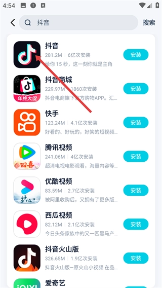 3、在搜索结果中找到【抖音】应用条目,点击进入应用详情页面。