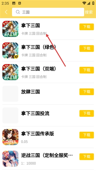 3、在搜索结果页面选择心仪的游戏(如《拿下三国》),点击进入游戏详情页面。