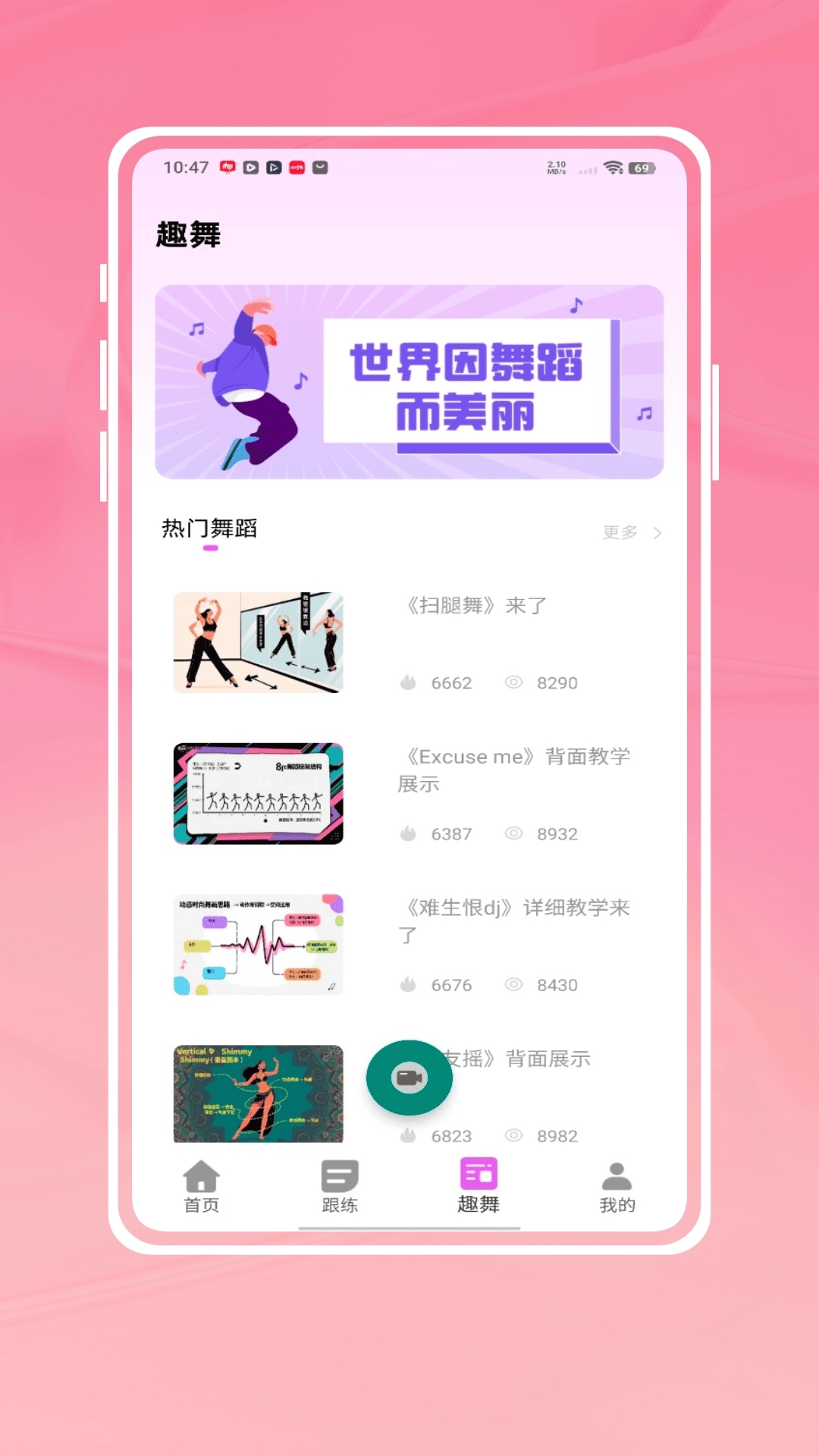 4、首页下方导航栏中还有跟练、趣舞等板块,选择其中自己感兴趣的舞蹈可以进行练习。