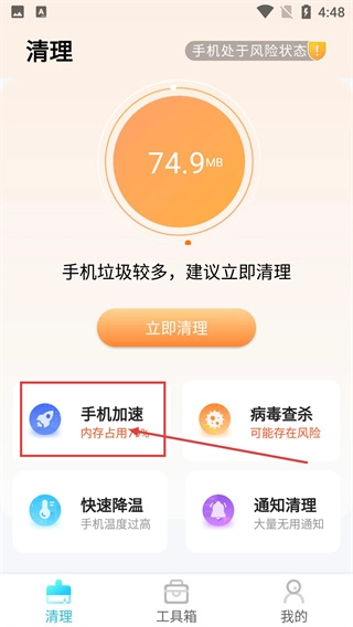 1、打开清理页面后,能看到手机垃圾有74.9MB,系统提示“手机垃圾较多,建议立即清理”,点击【手机加速】选项,即可进入加速流程。