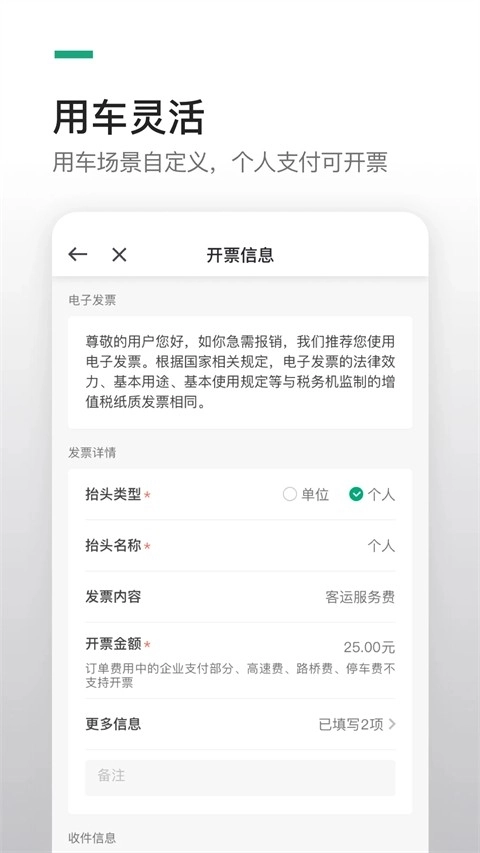 3、用车灵活,用车场景自定义,结束后统一结算并管理订单、个人支付可开票。