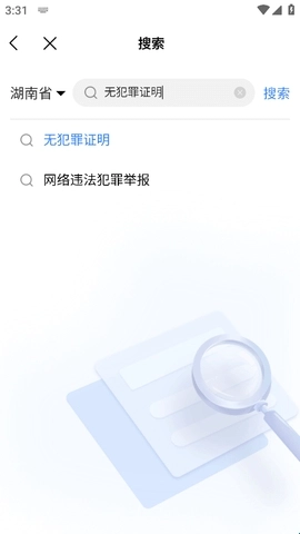 2、接着在搜索框中输入“无犯罪证明”,待搜索结果显示后点击进入。