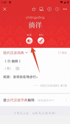 3、然后就能看到这个词的解析、拼音、书写等信息,点击“听书”,就能知道它的发音了。