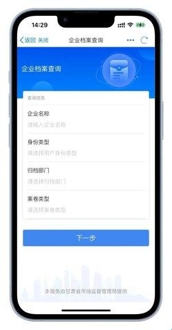 4、在查询页面输入企业名称并选择身份类型、归档部门与案卷类型,点击“下一步”。