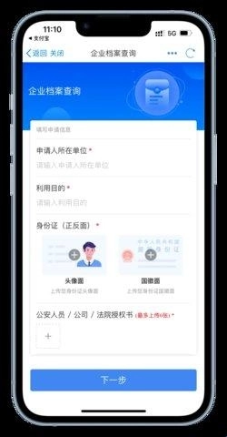 7、填写申请信息,包括申请人所在单位、利用目的并上传身份证正反面照片与公安人员/公司/法院授权书后,点击“下一步”即可申请。