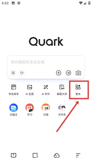 1、打开夸克主界面后,点击【更多】按钮,即可展开更多功能选项。