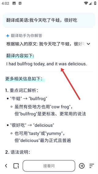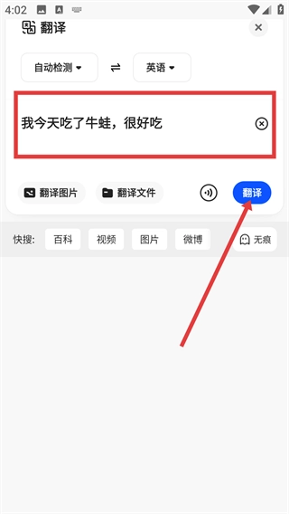 3、在翻译界面输入要翻译的文字,如【我今天吃了牛蛙-很好吃】,点击【翻译】按钮。