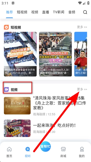 2、在视听页面,点击视频右侧的更多,进入列表。