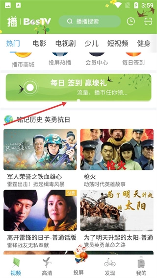 4、登录后进入主界面,可看到【热门】【电影】等分类,点击【每日签到赢壕礼】可参与签到活动,还能浏览各类影视内容。
