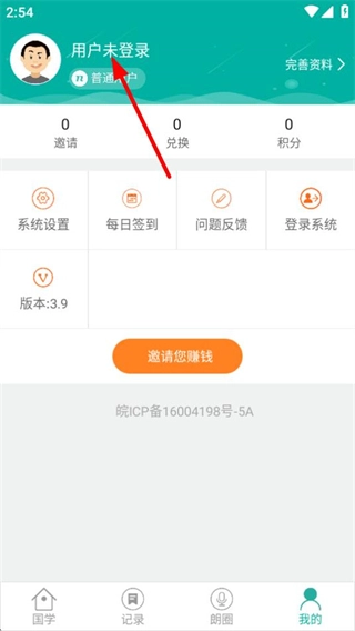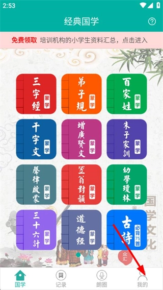 1、进入经典国学页面后,点击右下角的“我的”选项,即可进入个人页面。