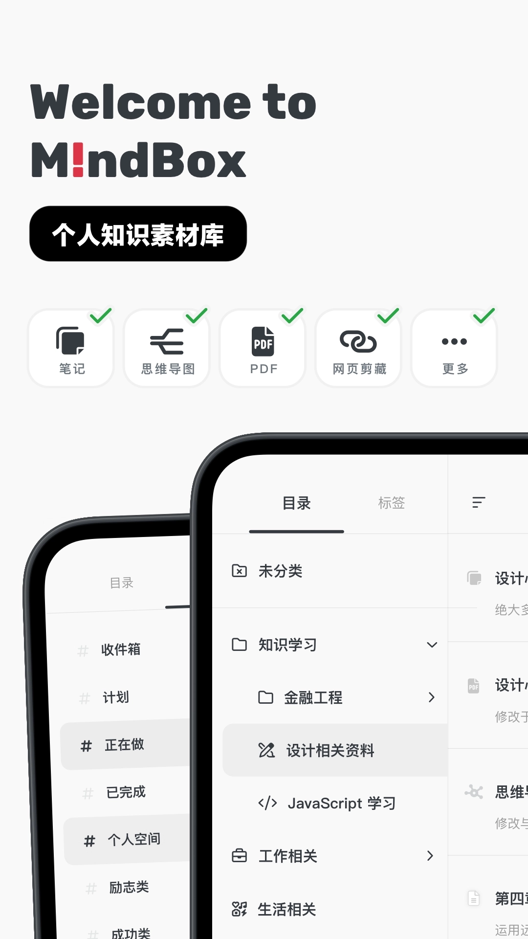 Mindbox主要用了大家所熟悉的文件夹系统,进行管理所有的知识素材。在文件夹中,你可以添加笔记、思维导图、网页剪藏、PDF、Office文档、图片…各种模块。