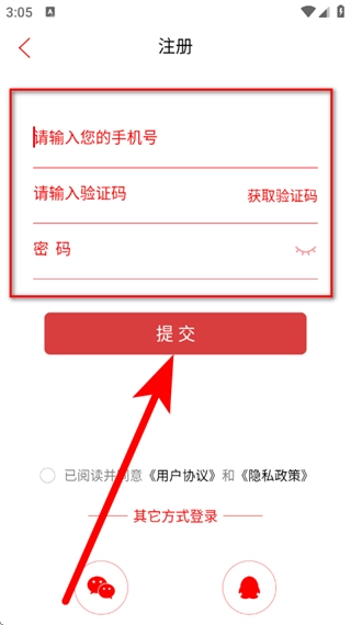 4、输入手机号、验证码、密码,勾选后,点击提交,完成注册操作。