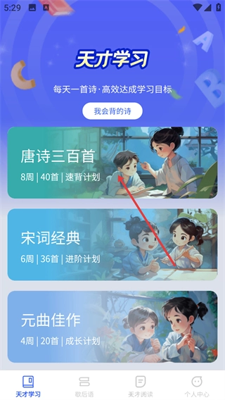 1、点击【唐诗三百首】选项,即可进入唐代背诗计划页面。