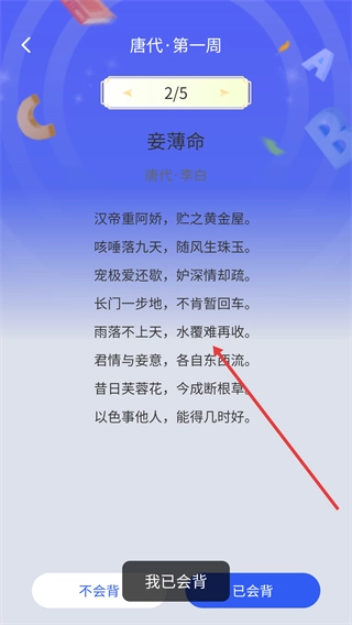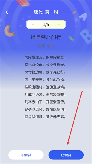 3、在唐代第一周背诗页面,若已会背当前诗歌,点击【已会背】按钮。
