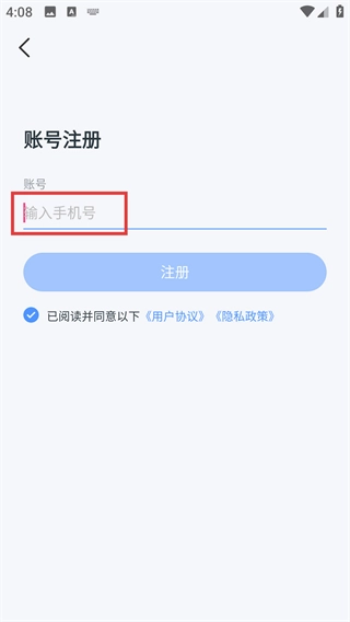 3、在账号注册页面的手机号输入框中输入手机号码。