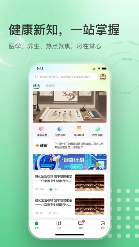 每日健康手机版是一款汇聚海量健康资讯的应用软件,平台内整合了众多精选健康热点、医学资讯、养生动态及权威医学文章等内容,并且每日都会更新全新的数字资讯报道,用户可一键订阅和关注感兴趣的健康信息;未来大家在线阅读海量健康生活资讯将变得十分便捷;此外,每日健康最新版还配备了实用的即时通讯工具,方便用户轻松在线分享经验、交流心得;对这款软件感兴趣的用户可以直接在本站体验。