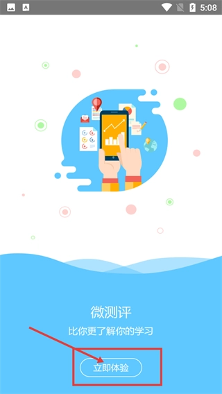 1、打开应用后进入启动页,页面展示“微测评-比你更了解你的学习”的标识,点击页面上的【立即体验】按钮,就能进入应用的后续操作流程。