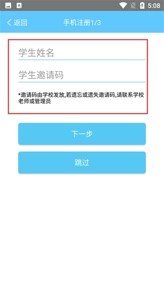 3、进入手机注册页面,需填写【学生姓名】【学生邀请码】(邀请码由学校发放),填写后点击【下一步】,也可选择【跳过】。