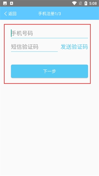 4、进入注册的下一步页面,需输入【手机号码】,点击【发送验证码】并填写,完成后点击【下一步】继续注册流程。