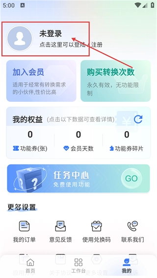 2、进入主界面,可看到【PDF转Word】【PDF转图片】等转换功能,点击底部【我的】按钮,可进入个人中心页面。