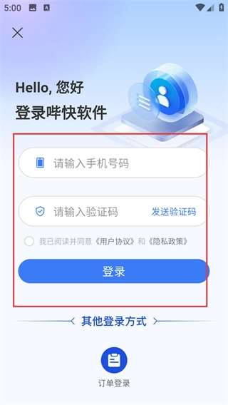 4、进入登录页面,可通过输入手机号码+验证码的方式登录,需勾选相关协议,也可选择其他登录方式完成账号验证。