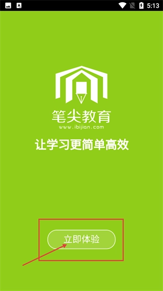 2、进入应用启动页,显示“笔尖教育-让学习更简单高效”标识,点击【立即体验】按钮,可进入后续登录或注册流程。