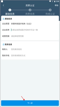 3、填写企业的基础信息及联系人信息,再点击下一步。