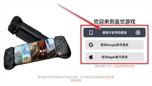 1、打开盖世游戏App,选择登录方式(未注册的手机号码登录时将自动注册)。这里以手机号码登录为例。