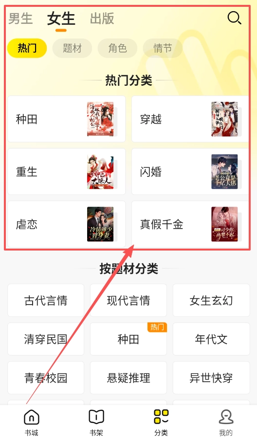 2、在“分类”页面,系统将书籍按男生、女生、出版等大类划分,并提供了种田、穿越、虐恋等细化标签,帮助你快速定位感兴趣的类型。